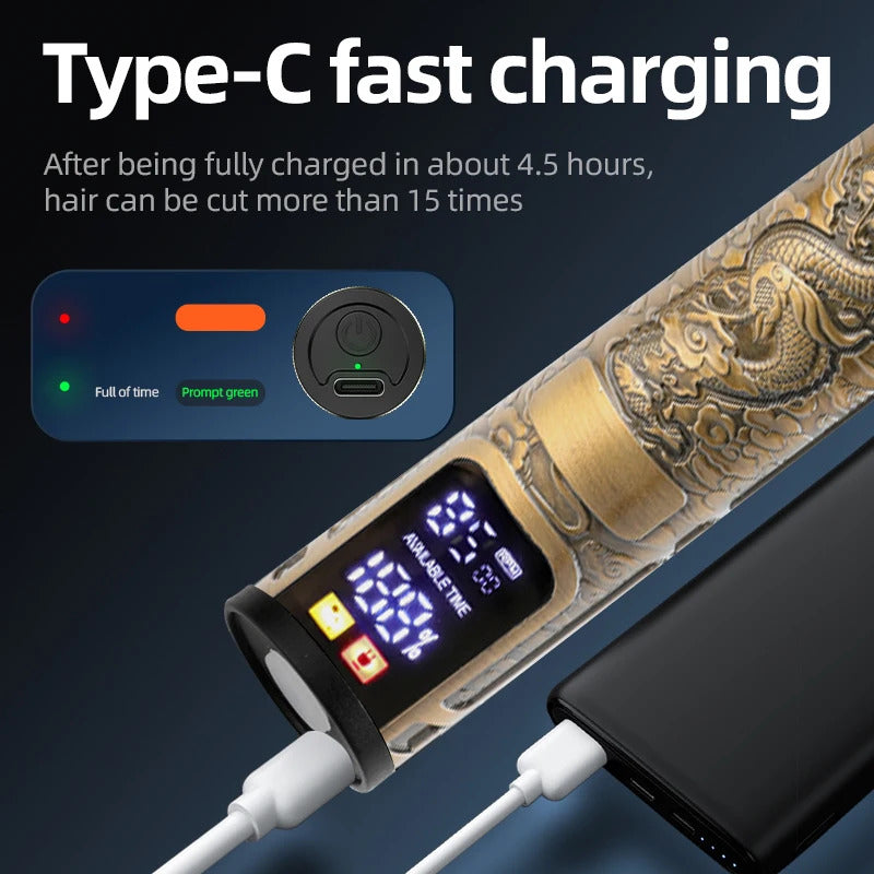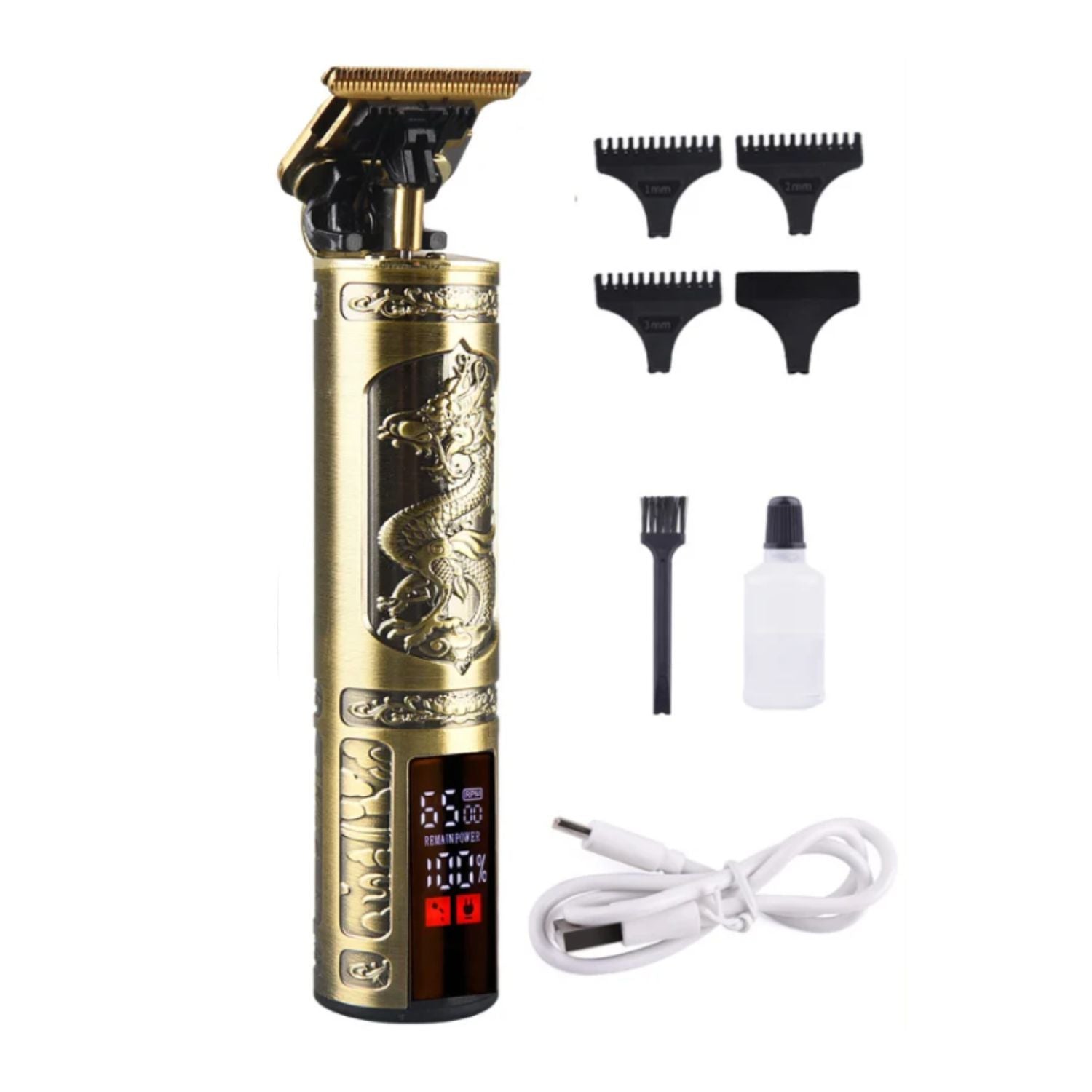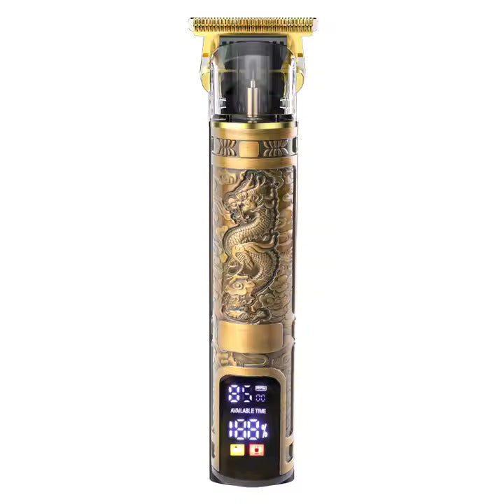 Esta máquina cortapelos inalámbrica es ideal para barberías, peluqueros a domicilio o uso personal. Con un diseño exclusivo en metal grabado con figuras de dragón , no solo ofrece un excelente rendimiento, sino también una estética imponente.